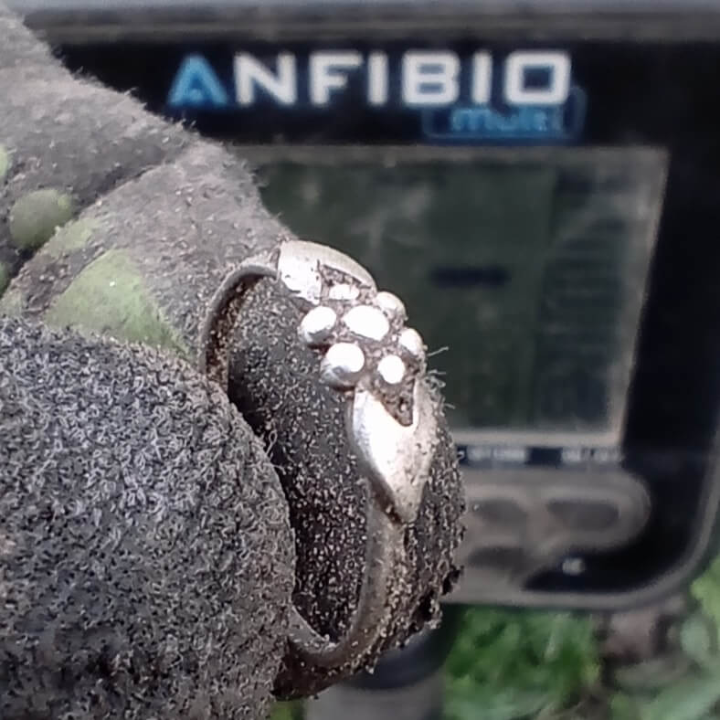 Anfibio Multi dedektörle 2 adet gümüş yüzük ve Bershka saat buldum. Her iki yüzük te yaklaşık 10-12cm derinlikten çıktı ve 53-60 arası bir VDI verdi. Büyük olan bankın yanındaki çöplerin arasına gömülmüştü. Önce bir alüminyum kutu parçası olacağını düşündüm ama pinpoint küçük bir nesneye işaret ediyordu. Bu dedektörü bir buçuk yıldan beri kullanıyorum ve her aramamda ondan daha çok etkileniyorum.