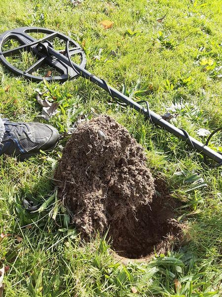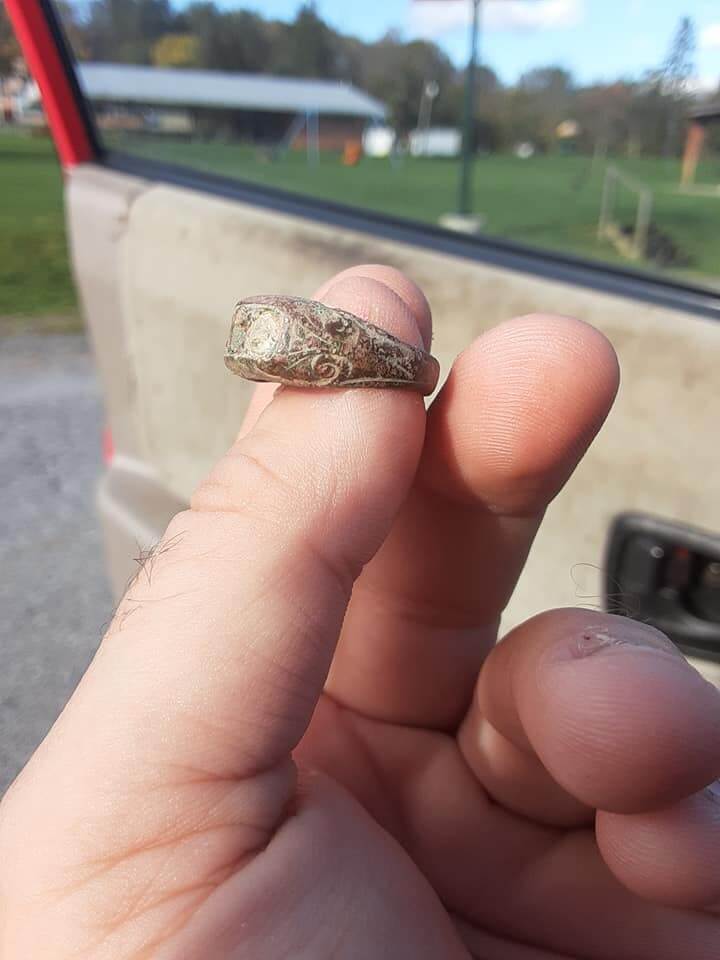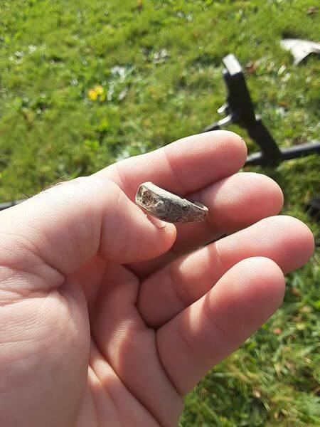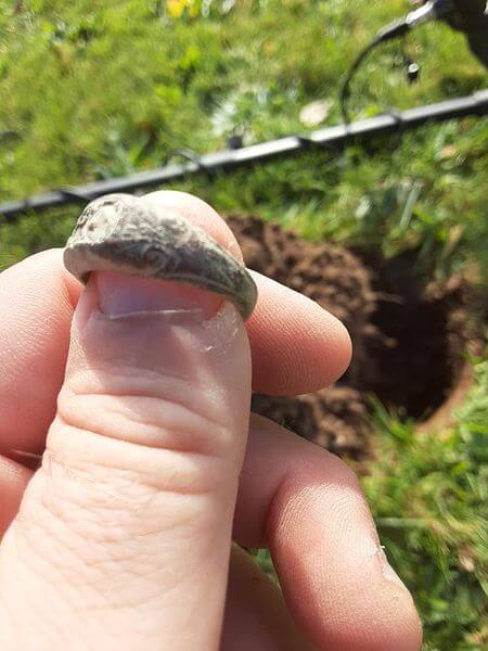 Bu sabah işe gitmeden önce yaklaşık 10 dakikam vardı. Kendi bahçeme çıktım, daha önce kardeşim tarafından 1000’lerce kez tarandı. Bu dedektörün derinliği maksimum seviyede. 20-22cm derinlikten gördü ve bu yüzük ortaya çıktı. Oldukça eski bir yüzük olduğunu düşünüyorum. Evin tarihi 1950’lerin başına dayanıyor ama bence yüzük çok daha eski. Ya pirinç ya da bakır.