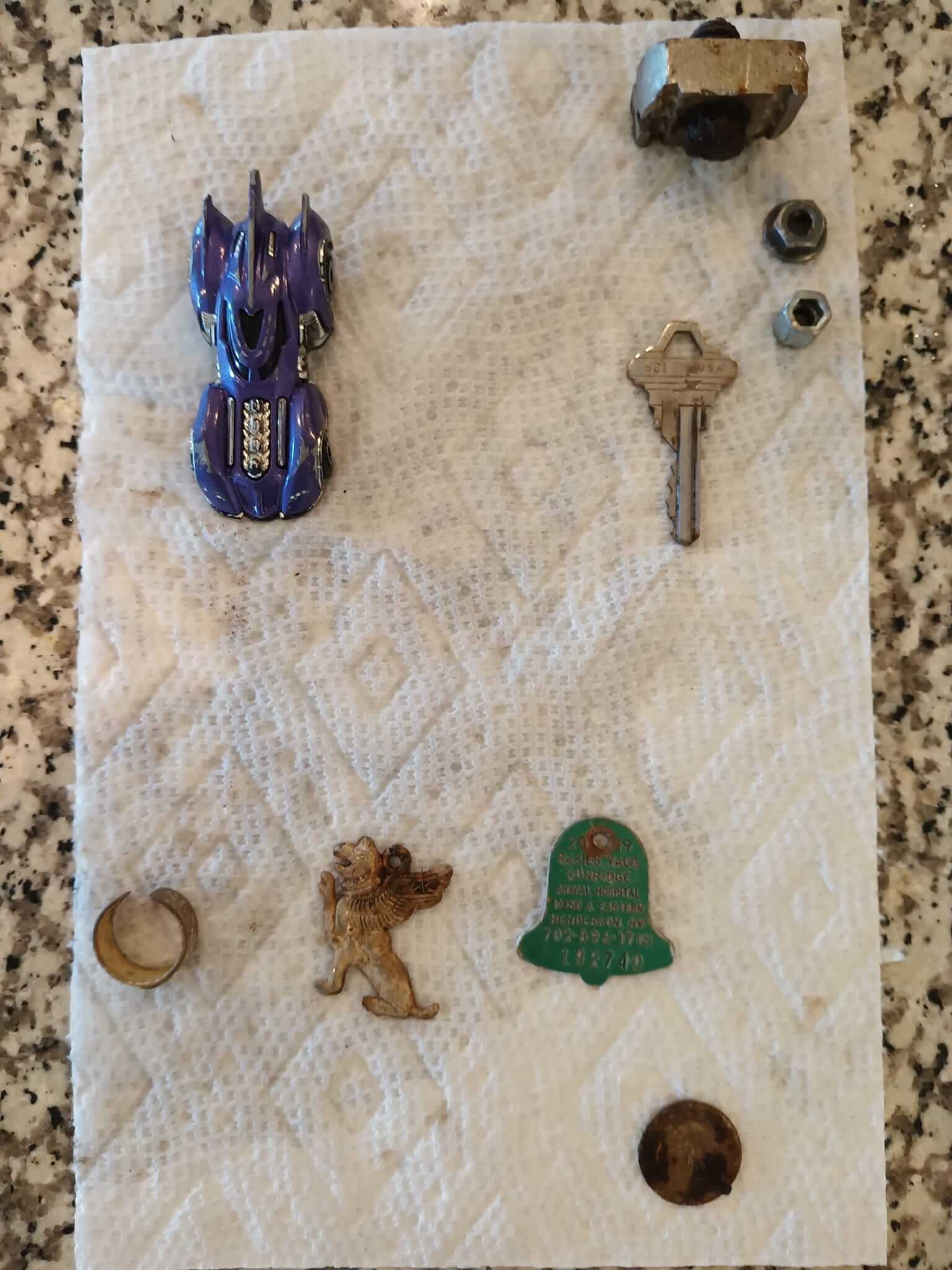 Bugün gümüş gibi görünen 1 yüzük, 1 aslan kolye, 1 köpek etiketi, 1 oyuncak araba, 1 jeton, 9 çeyrek, 11 on sent, 9 nikel, 79 peni buldum. Yerel parkta bir başka harika gün. Herkese iyi avlar…